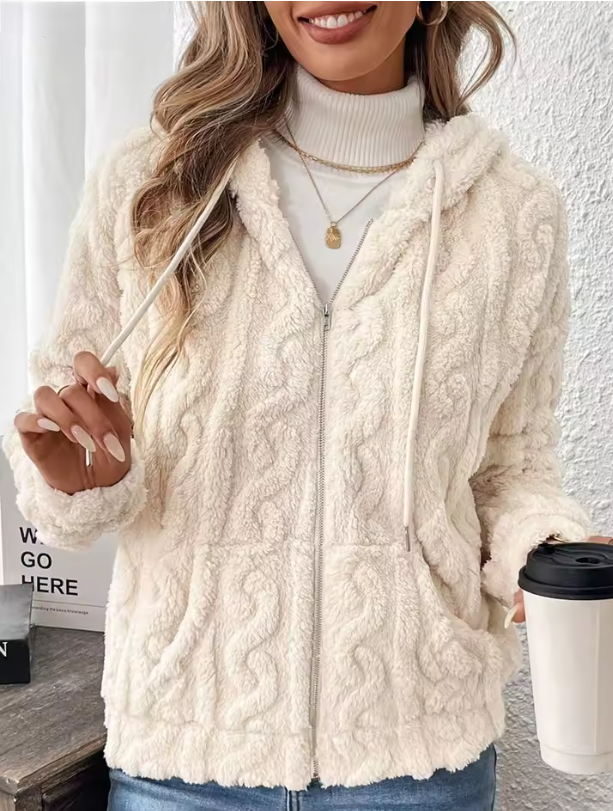 Dimentica i capi che ti lasciano a desiderare in termini di comfort e stile. Ti presentiamo il capo essenziale che ridefinisce l'idea di abbigliamento rilassato: il nostro Cardigan Felpato con Cappuccio in un lussuoso e caldo color crema. Non è una semplice felpa, ma un vero e proprio abbraccio di morbida pelliccia sintetica testurizzata con un motivo a treccia in rilievo che aggiunge un tocco di eleganza inaspettata. Questo è il pezzo unico che ti farà sentire coccolata, distinguendoti dalla massa grazie al suo look accogliente e chic. Preparati a innamorarti del comfort che non sacrifica lo stile.